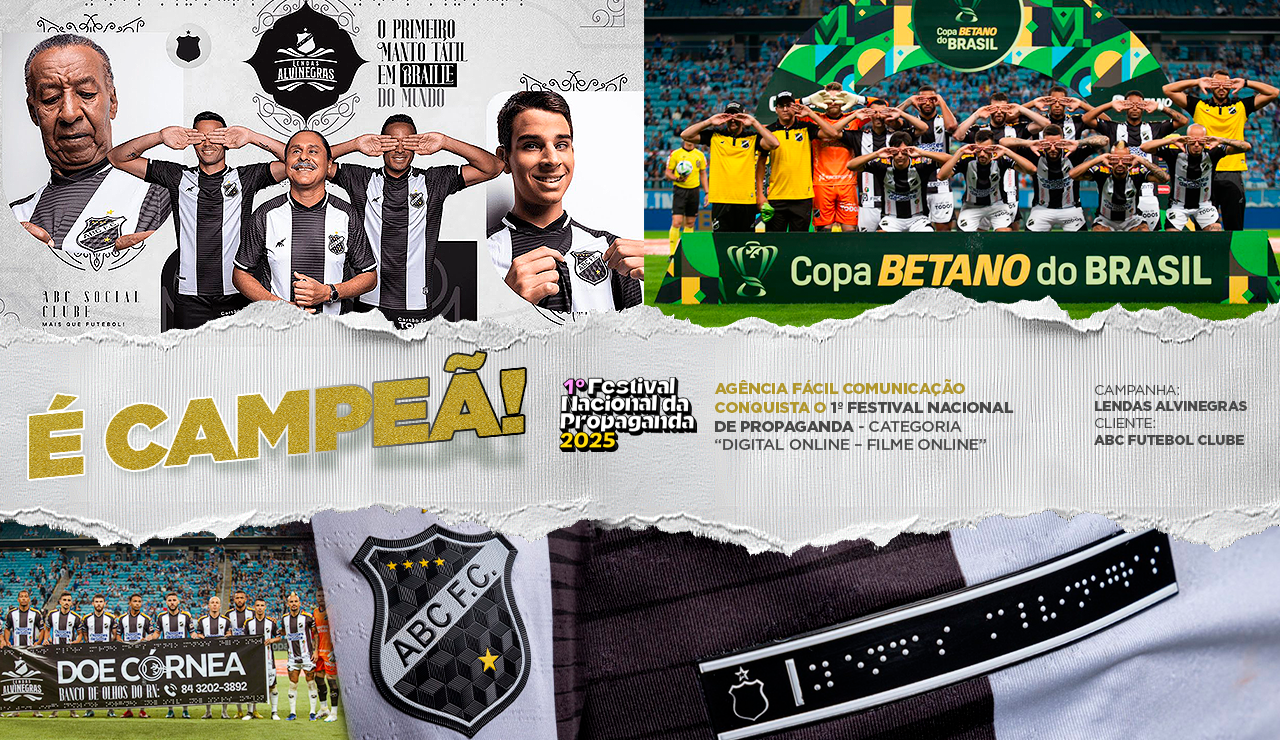 A agência Fácil Comunicação conquistou o 1º Festival Nacional da Propaganda, com o prêmio na categoria Digital Online – Filme Online com o vídeo “Lendas Alvinegras”. A premiação foi anunciada nesta segunda-feira (22), durante transmissão online realizada no canal da Federação Nacional das Agências de Propaganda (Fenapro) no YouTube. A conquista consagrou ainda a agência no TOP 10 da propaganda brasileira. O vídeo premiado marcou o lançamento inédito de uma camisa oficial do ABC Futebol Clube desenvolvida com tecido tátil e leitura em braile, pensada especialmente para deficientes visuais. A ação também despertou para uma campanha de conscientização sobre a doação de córneas, reforçando o compromisso social do clube e da agência com inclusão, acessibilidade e empatia.